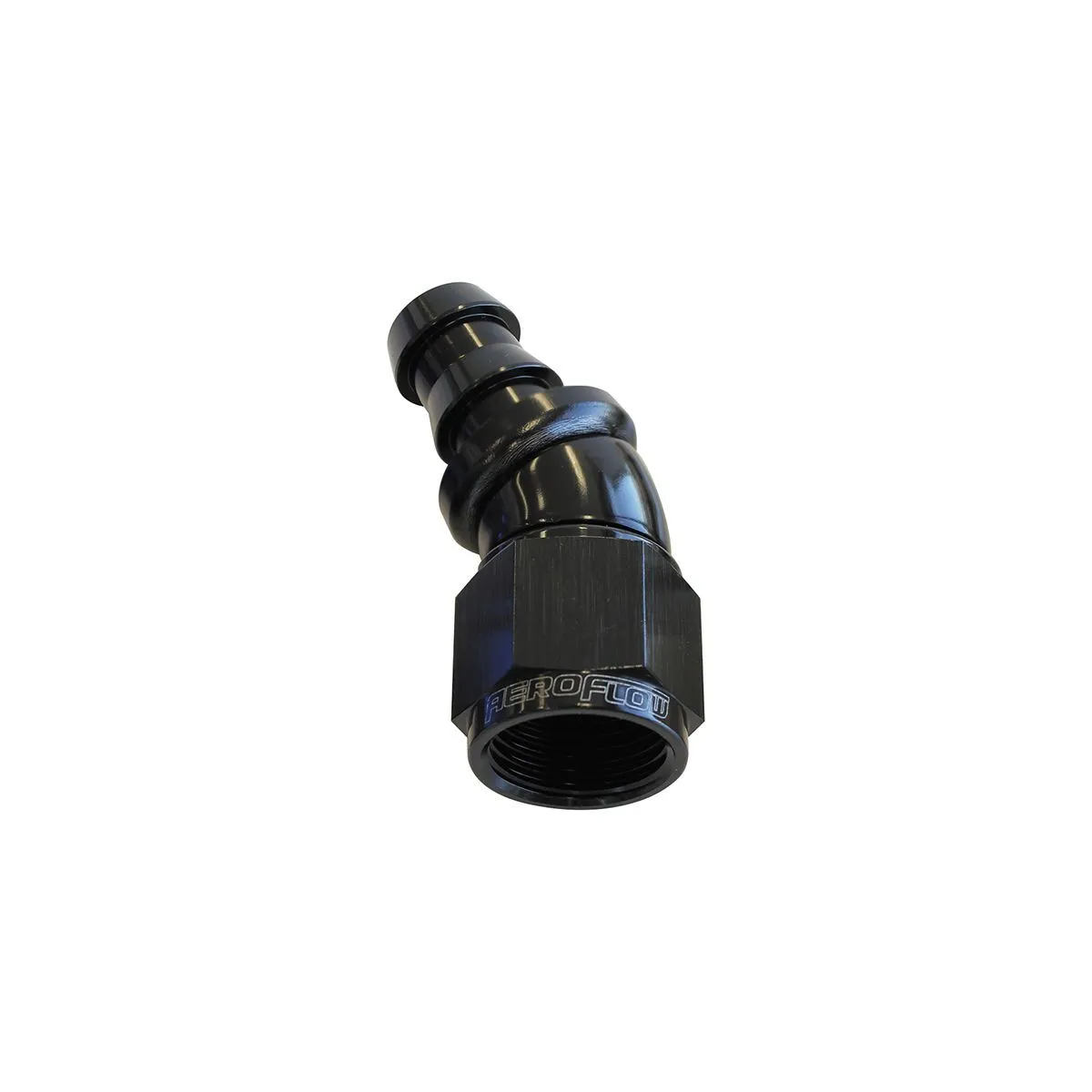 Note: Not compatible for power steering and automatic transmission line applications. Hose ends are hard anodised (excluding Silver finish).Aeroflow's 510 series push lock fittings are a CNC machined one piece fitting which provide uninterrupted flow. The mandrel bent tight radius body has superior wall thickness with a custom designed barbed end to allow a quick, easy and leak free assembly. Aeroflow's push lock fittings come with a purpose designed cover to hide the messy cut end of the hose to give you that professional look everytime. Compatible Hose: 400 and 500 Series Push Lock hose (Blue and Black).