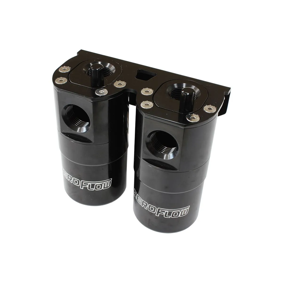 The Aeroflow performance billet universal air / oil separator has been designed to protect your modern diesel & petrol engines by reducing the amount of oil vapour entering the crankcase. With many modern diesel engines having a EGR system where the combination of oil vapour and exhaust particles build up to the point of blocking the intake manifold and intake ports that is very common in direct injection engines. It features stainless steel reusable and cleanable filter mesh, a built in billet dipstick, two -10ORB ports and one -4AN which can be utilised for a drain. It comes in the single version or the dual version which is essentially two single catch cans mounted to a one-piece universal mounting bracket. Available in polished or black.