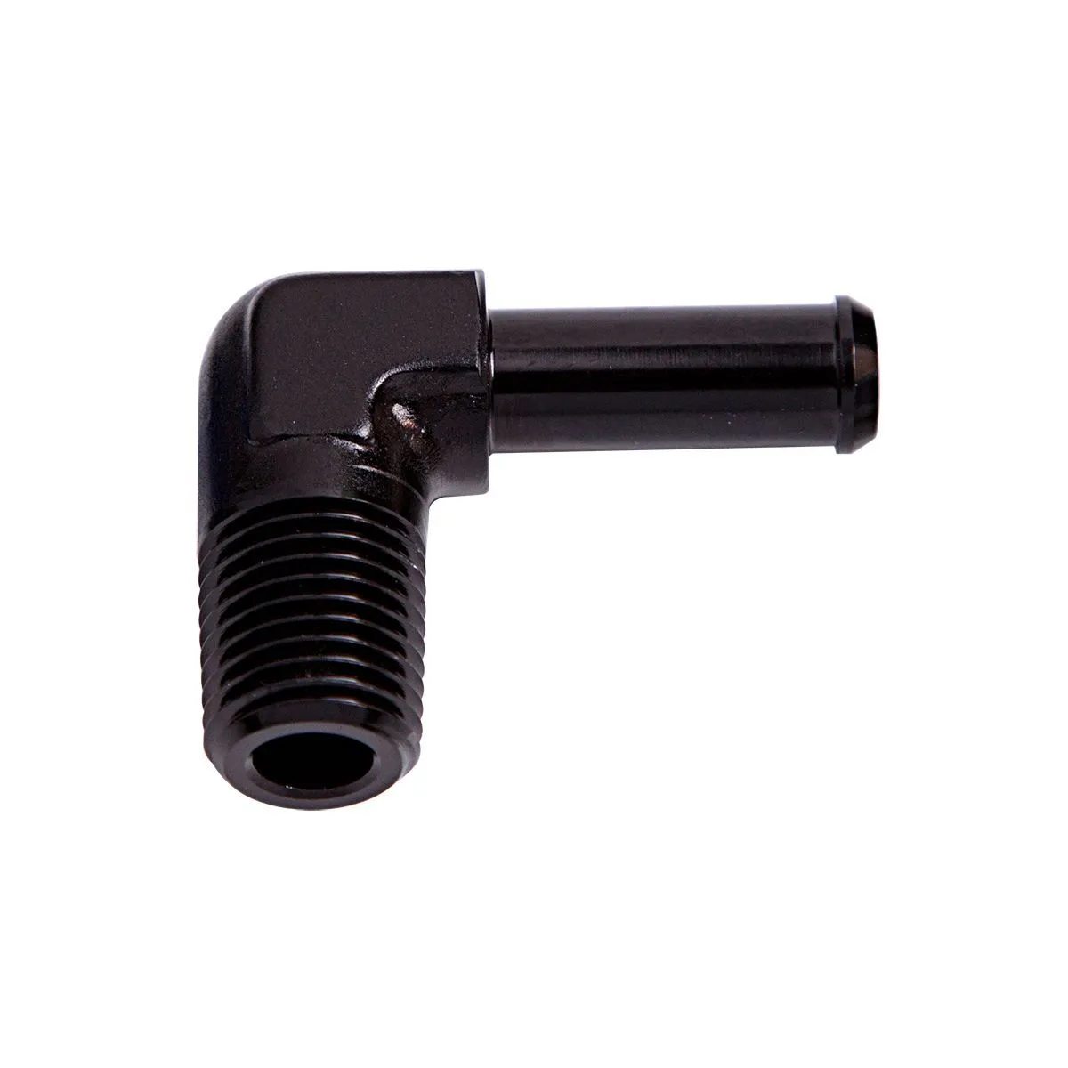 These handy NPT to 90 degree hose barb fittings are designed to allow easy fuel line installation on electric fuel pumps and regulators when using rubber fuel line. They have a male NPT fitting on one end and a barbed fitting on the other end and they're available in different sizes to fit your needs.These barb sizes are designed to work with Aeroflow 400 series and 500 series Push Lock Rubber hose. Available in various sizes with Blue, Black and Silver finishes.