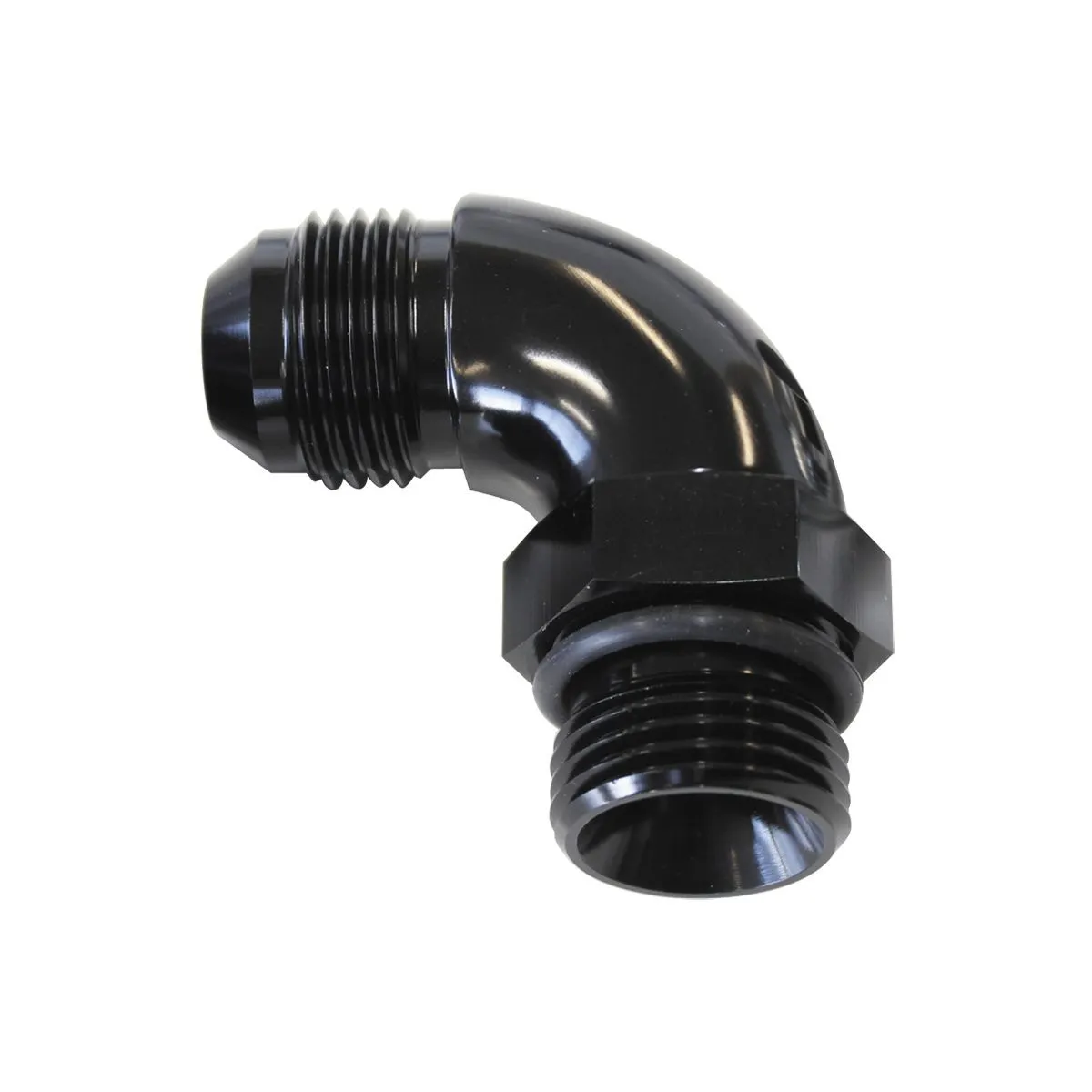 Male ORB to Male AN adapter. Adapt from an ORB thread to AN flare with a 90 degree bend. One piece body with Jam Nut to lock position. Various sizes available.