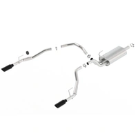 Fits through the factory bumper cut-outs (bumper has notches on the bottom). This system features a Black Chrome finish on T-304 stainless steel tips. Using BORLA(r) Stainless Steel Polish p# 21461 is NOT recommended with these black chrome tips. We suggest cleaning the tips with hot water and a microfiber cloth. BORLA(r) Cat-Back(tm) and Axle-Back exhaust systems feature patented straight-through and multi-core technology designed to unleash hidden horsepower. Increased exhaust velocity adds power, driving excitement, fuel economy, and the distinctive BORLA(r) Sound of Power respected by motoring enthusiasts everywhere. Each system is built from premium, high quality austenitic T-304 stainless steel, superior to T-400 series knockoffs (such as 409), to give you the absolute best in performance and durability. Ultra-smooth mandrel bends ensure maximum flow& power, and precision computer numerical control (CNC) manufacturing ensures an accurate fit. Best of all, BORLA(r) stands behind every system with a Million-Mile Warranty. Just what you'd expect from the world's most experienced (and most winning) exhaust brand.