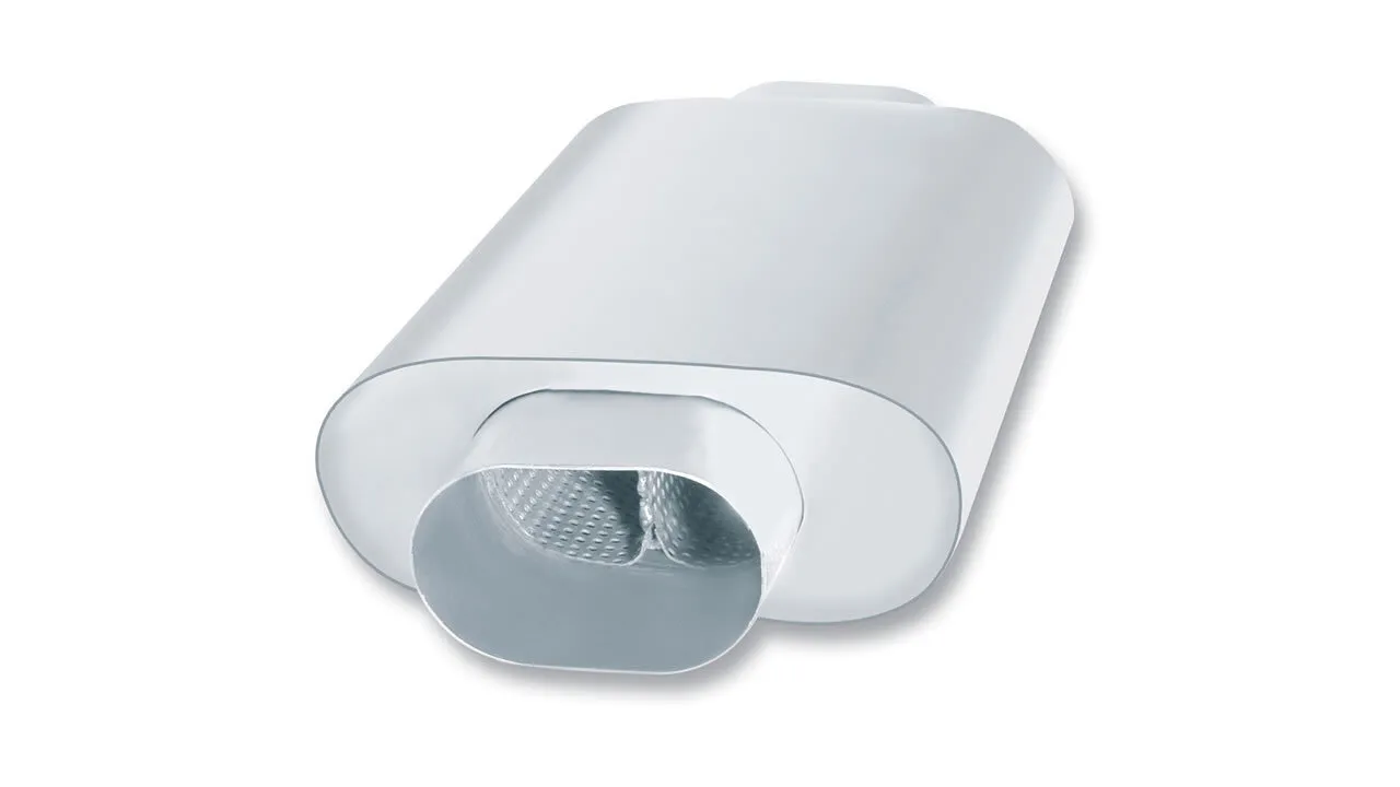 Slim Line Racing Muffler. Designed for low profile vehicles with limited space. It features a 3" x 7.88" oval body. Necks are 3.5" tubing formed into 4.13" x 2.61" oval. Reversible design for installation flexibility. Patented Multicore design for maximum power. Recommend for high horsepower applications. T-304 stainless steel will never rust. 100% welded construction for strength. High temperature T-304 stainless steel wool for sound control. There is no logo embossment on this part.