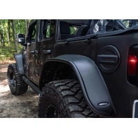 Be ready for anything: Equip your Jeep with Bushwacker Flat Style Fender Flares. They're the first and only flat style flares made to absorb impact using our proprietary Dura-Flex 2000 TPO the thickest, most flexible material available. Flat Style Fender Flares maximize your tire coverage and wheel articulation for intense off-road use. Yet they're carefully engineered to install with a minimum of extra tools and bodywork (see the installation guide for your specific vehicle for details). For example, our mounting brackets bolt straight onto your Jeep for added strength and simpler fitting. Our design integrates neatly with the factory rocker guards, and incorporates DOT-compliant LED side marker lights and fully molded wheel well protection. The flares are 100% UV protected, too, to stop chalking in its tracks. If you want the look and the real-world performance that best fits an American icon, nothing goes with your Jeep better than Bushwacker Flat Style Fender Flares.
