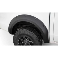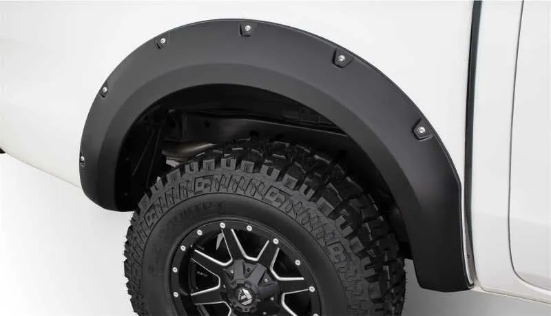 With their recessed stainless steel bolts and massive presence, Pocket Style Fender Flares are a Bushwacker original and an off-road icon. They give you the hard-core look of bolt-on flares, with no body-side sheet metal drilling required. Pocket Style Fender Flares are custom-designed for your vehicle to complement oversized tires and high-clearance lift kits. You can mount them right out of the box with their tough, OEM-style matte black finish they're UV protected so they won't chalk. You can also paint them to match or accent the body color for a factory-custom look. Pocket Style Fender Flares are made from our thick, warp-resistant Dura-Flex 2000 material and tailor-made for added durability and flexibility on the trail. When you need maximum tire coverage with minimum time and effort, it's in the pocket. Pocket Style Fender Flares from Bushwacker.