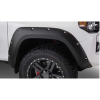 With their recessed stainless steel bolts and massive presence, Pocket Style Fender Flares are a Bushwacker original and an off-road icon. They give you the hard-core look of bolt-on flares, with no body-side sheet metal drilling required. Pocket Style Fender Flares are custom-designed for your vehicle to complement oversized tires and high-clearance lift kits. You can mount them right out of the box with their tough, OEM-style matte black finish they're UV protected so they won't chalk. You can also paint them to match or accent the body color for a factory-custom look. Pocket Style Fender Flares are made from our thick, warp-resistant Dura-Flex 2000 material and tailor-made for added durability and flexibility on the trail. When you need maximum tire coverage with minimum time and effort, it's in the pocket. Pocket Style Fender Flares from Bushwacker.