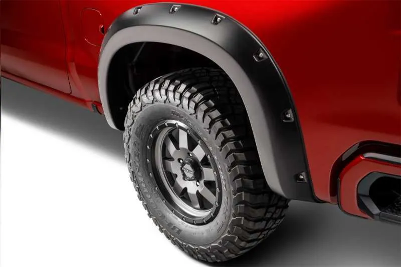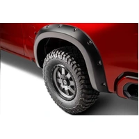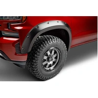 With their recessed stainless steel bolts and massive presence, Pocket Style Fender Flares are a Bushwacker original and an off-road icon. They give you the hard-core look of bolt-on flares, with no body-side sheet metal drilling required. Pocket Style Fender Flares are custom-designed for your vehicle to complement oversized tires and high-clearance lift kits. You can mount them right out of the box with their tough, OEM-style matte black finish they're UV protected so they won't chalk. You can also paint them to match or accent the body color for a factory-custom look. Pocket Style Fender Flares are made from our thick, warp-resistant Dura-Flex 2000 material and tailor-made for added durability and flexibility on the trail. When you need maximum tire coverage with minimum time and effort, it's in the pocket. Pocket Style Fender Flares from Bushwacker.