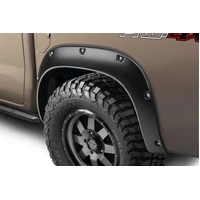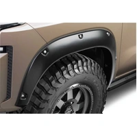 With their recessed stainless steel bolts and massive presence, Pocket Style Fender Flares are a Bushwacker original and an off-road icon. They give you the hard-core look of bolt-on flares, with no body-side sheet metal drilling required. Pocket Style Fender Flares are custom-designed for your vehicle to complement oversized tires and high-clearance lift kits. You can mount them right out of the box with their tough, OEM-style matte black finish they're UV protected so they won't chalk. You can also paint them to match or accent the body color for a factory-custom look. Pocket Style Fender Flares are made from our thick, warp-resistant Dura-Flex 2000 material and tailor-made for added durability and flexibility on the trail. When you need maximum tire coverage with minimum time and effort, it's in the pocket. Pocket Style Fender Flares from Bushwacker.