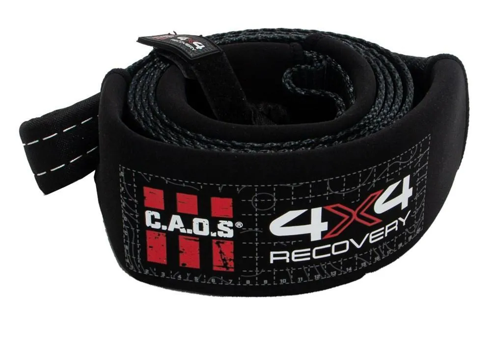 CAOS 8T Tree Saver, Winch Extension, Equalizer and Tow Strap - 75mm x 3m. NATA Laboratory tested and Certified with 11,165kg break strength and triple reinforced loops. The CAOS Tow Strap has an Australian Legislation compliant label. 100% polyester, folded, stitched and with canvas encased reinforced loops. Comes with a heavy-duty protective carry bag and a wide velcro tie which makes storing easier. CAOS 4X4 Recovery gear is a class above all else. NATA Certified with 11,165kg breaking strength – Tested Tough by Aussies for Aussies®.