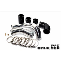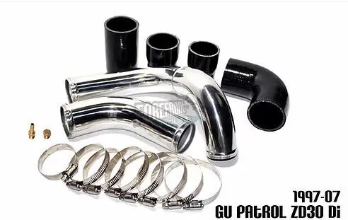 Our new kit completely replaces the factory intercooler piping that is known to split apart and expand under boost on the zd30 gu. Our kit replaces from the turbo to the intercooler and from the intercooler down to the throttle body . It uses stainless clamps , Polished alloy piping and thick reinforced silicone hoses.