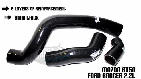 Our new silicone intercooler piping upgrade kit is a direct replacement for all of the intercooler hoses that are known to split apart and expand under boost On the 2012+ Ranger and BT50. Our pipe is 6mm thick and has 5 layers of reinforcement to make it considerably stronger than the factory pipe.