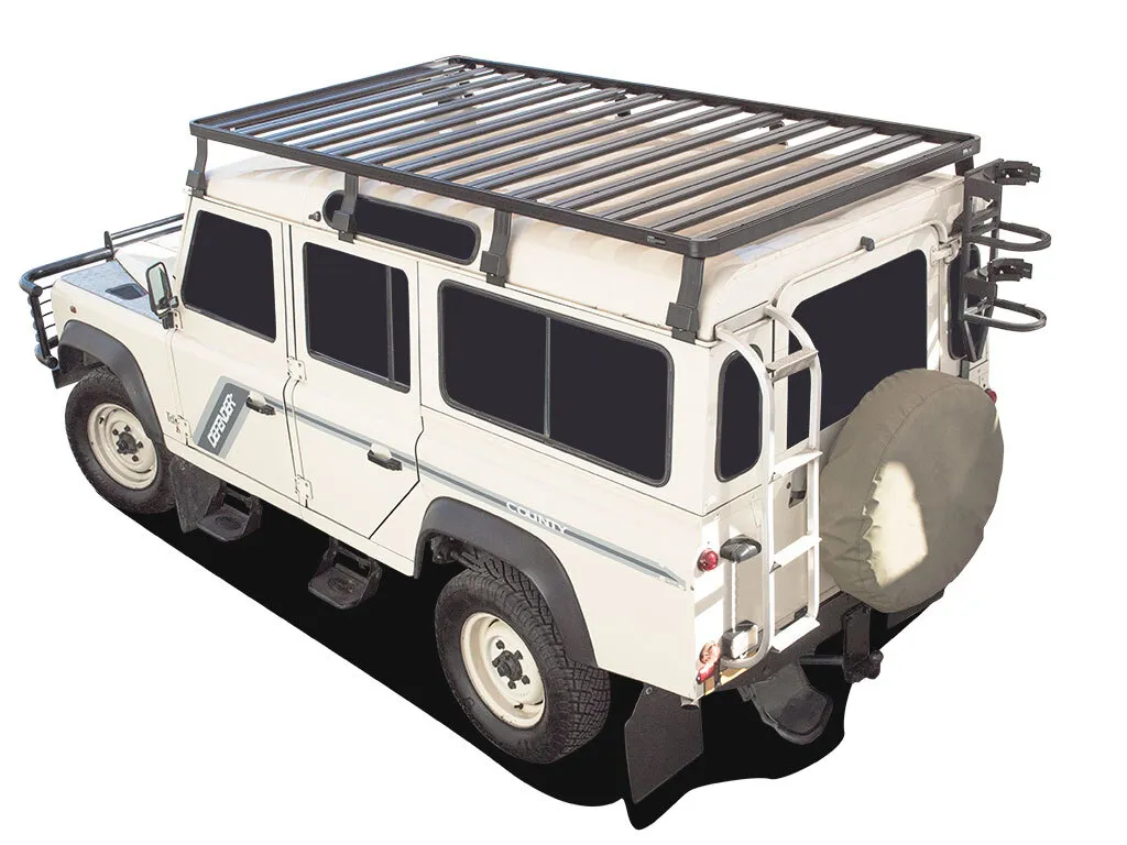 This 2772mm/109" long full-size Slimline II cargo carrying roof rack kit for the Land Rover Defender 110 contains Slimline II Tray and Wind Deflector, as well as 8 Gutter Mount legs for mounting the Tray to the vehicle. This taller kit has space for mounting the Front Runner tables or other compatible accessories under the rack. It installs easily with no drilling required.
