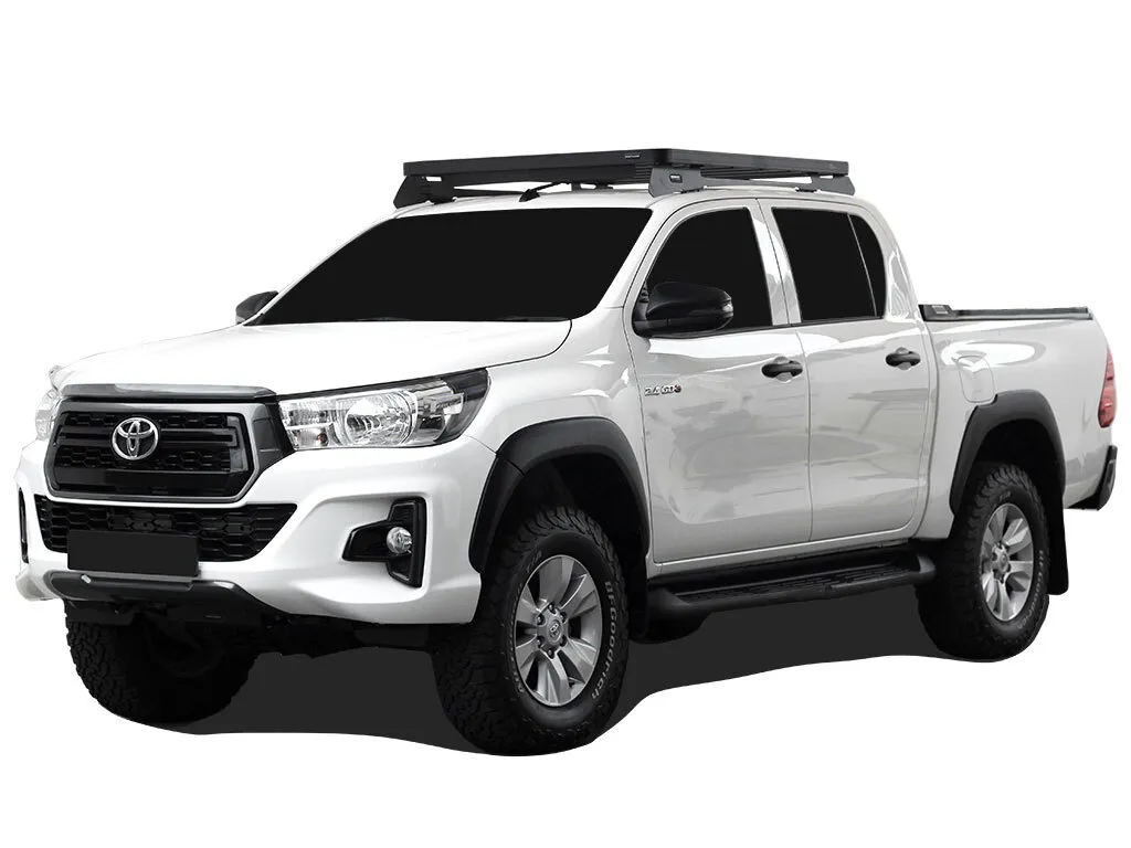 This 1358mm/53.5" long full-size Slimline II cargo roof rack kit contains the Slimline II Tray, Wind Deflector and 2 Foot Rails to mount the Slimline II Tray to your Toyota Hilux Revo Double Cab. Drilling into the vehicles roof is required to insert mounting hardware, a template is provided for hole placement.