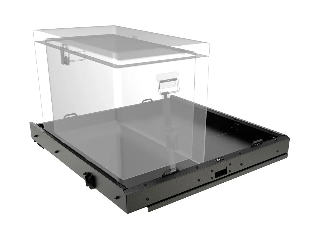 This “flat drawer” can hold a refrigerator along with chairs, cargo boxes, and other gear. Or it can simply be used to easily access groceries and other everyday items.Secure up to a 52L (or equivalent) size fridge, with additional room for storage -- such as the Front Runner Wolf Packs or Cub Boxes, tents, chairs, camp kitchen items, tool kits, etc.