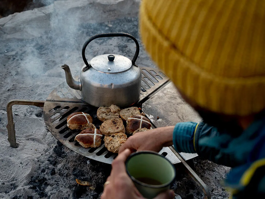 • Grill and griddle sections for campfire cooking options.
