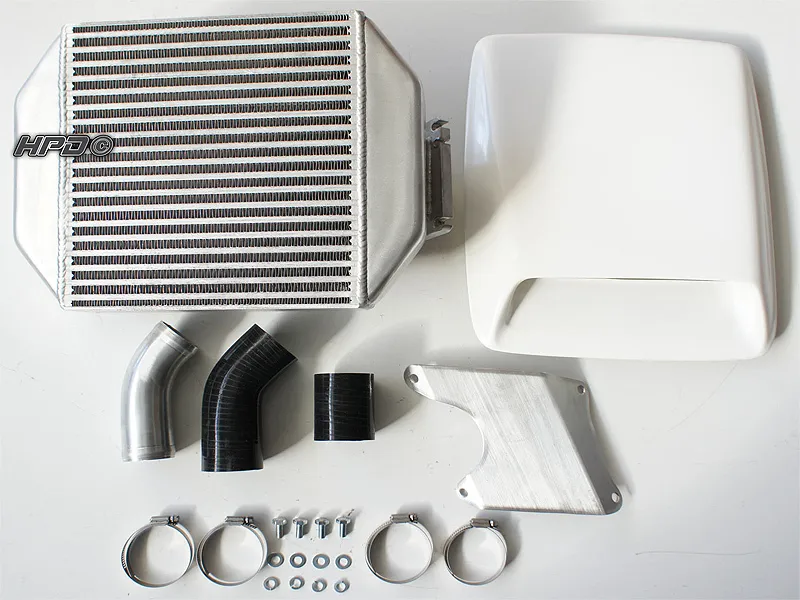 • Toyota Landcruiser 1HDFT 80 series 24 valve top mount intercooler kit. 280x300x76 bar & plate intercooler, bonnet scoop, silicone hoses & clamps.