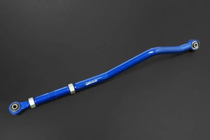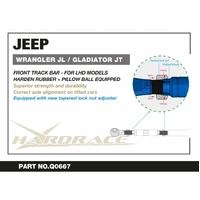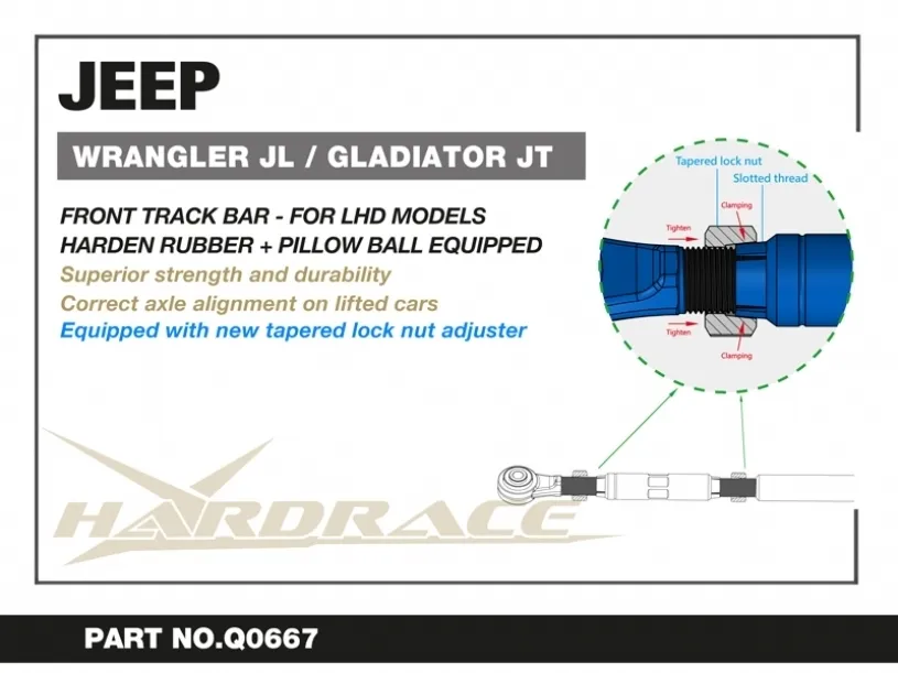 Track bar controls lateral movement of the axle housing. Once the car is lifted, the added height will throw off the alignment of the track bar, shifting the axle to one side. Adjustable track bars allow you to re-center the axles and keep the vehicle tracking straight down the road. Hardrace track bars are well-known for its high strength steel tube construction to withstand harshest off-road conditions. The innovative tapered lock nut adjuster system help secure the rod ends to the slotted thread control arms when being tightened, keeping the adjusters from coming loose due to vibration or suspension flex. It also features our harden rubber bushings and pillow ball bushing for both great ride quality and articulation, allowing you to tackle tough terrain.
