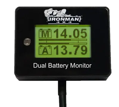 Keep a closer eye on your battery with the new Ironman 4x4 dual battery monitor. The new monitor displays a digital readout for both main and Auxilary battery, it also shows a bar graph style incidator. To ensure your batteries are healthy the Ironman 4x4 monitor shows if either battery is under charged (11V) or over charged (15v). We have built in an auto dimming feature to ensure this does not bother the driver at night. The monitor can be used with dual or single battery set ups.