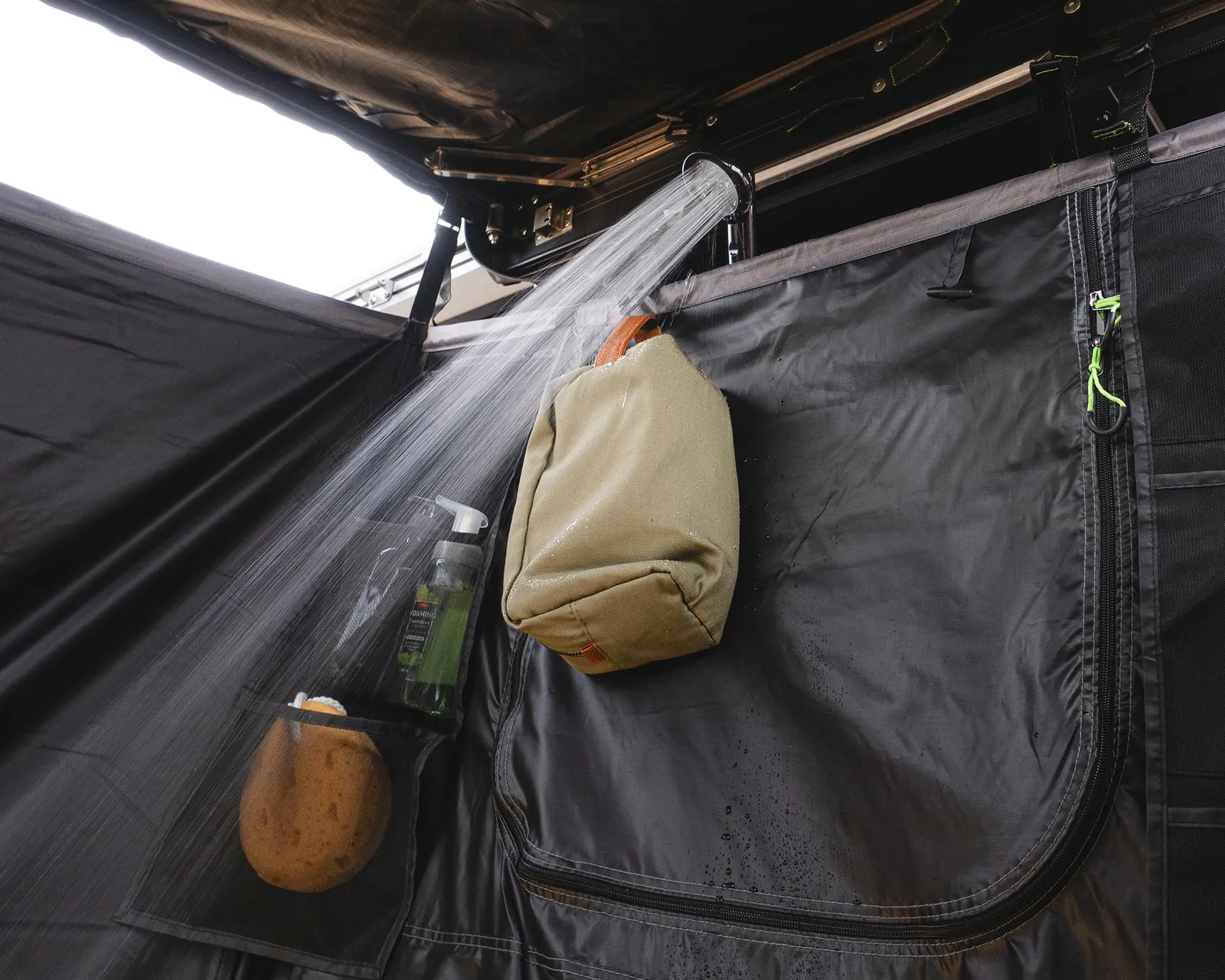 • Accessory pockets for your body wash, shampoo, conditioner and whatever else you need in your camp shower