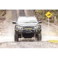 A-Frame 50mm triple loop design, integrated LED parker and indicator, high lift jack points, aerial tab. Driving light mounting locations. Reinforced front centre and side wing for protection.