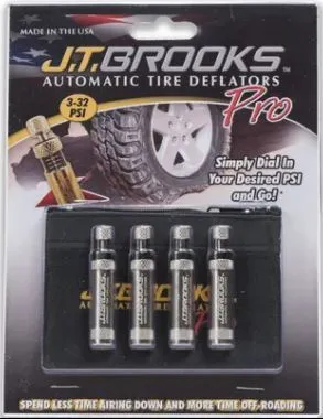 No one likes wasting time squatting down and running from tire to tire trying to set each tire to the correct PSI for maximum off-road traction. If you frequently air down to different pressures and want to eliminate the calibration process, then J.T. Brooks Automatic Tire Deflators Pro are exactly what you need. We have eliminated the need to calibrate each automatic tire deflator using a tire that has been deflated to the desired PSI. Simply use our precision laser engraved scale to dial in your desired PSI and go!* These deflators will automatically and accurately deflate your tires to a set PSI. Once you dial in your PSI, simply lock the tire deflators in place with the lock nut, screw them onto each tire’s valve stem, and let them do the work. The deflators will automatically shut off when the desired PSI is reached. By screwing one deflator on to each tire, all tires can be deflated simultaneously. This allows the user to complete other tasks while all tires are deflating. The automatic feature of these valves eliminates the need to manually deflate your tires, so you spend less time setting your tire pressure and more time off-road.