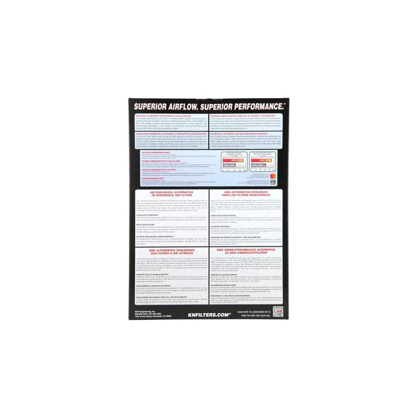 K&N® washable, reusable High-Flow Air Filters™ feature a state-of-the-art design of layered, oiled cotton media engineered to improve airflow and capture contaminants, and are designed to provide an increase in horsepower. Each performance air filter is reusable, engineered to last for the entire lifespan of your vehicle, and backed by K&N’s 10-Year/Million Mile Limited Warranty. K&N drop-in replacement filters are designed to install easily into your factory air box. Upgrade today and start enjoying superior airflow and superior performance from K&N’s most popular product!