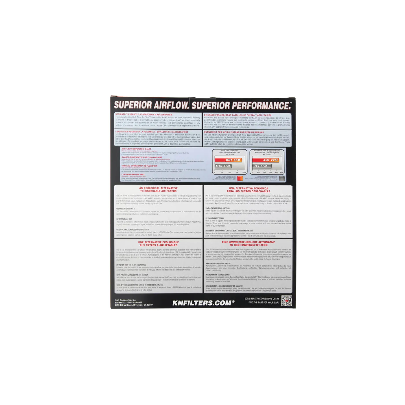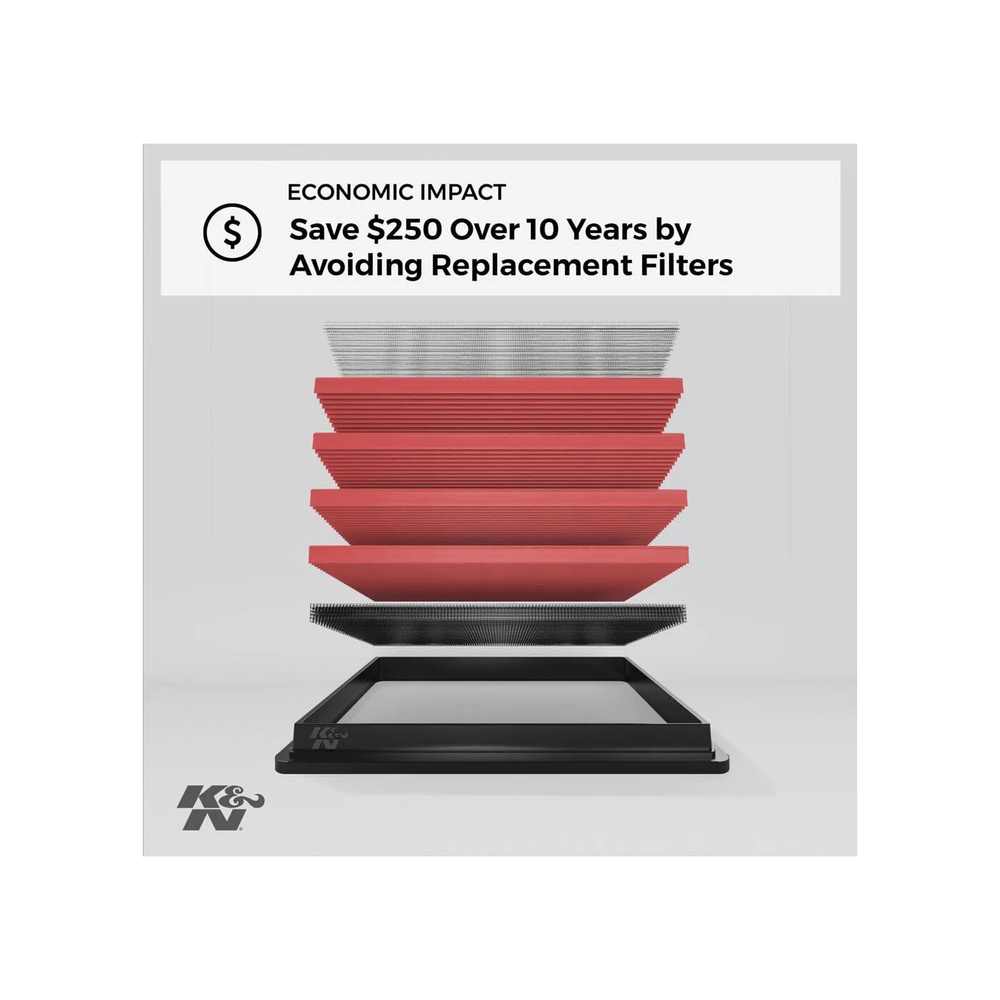 K&N® washable, reusable High-Flow Air Filters™ feature a state-of-the-art design of layered, oiled cotton media engineered to improve airflow and capture contaminants, and are designed to provide an increase in horsepower. Each performance air filter is reusable, engineered to last for the entire lifespan of your vehicle, and backed by K&N’s 10-Year/Million Mile Limited Warranty. K&N drop-in replacement filters are designed to install easily into your factory air box. Upgrade today and start enjoying superior airflow and superior performance from K&N’s most popular product!