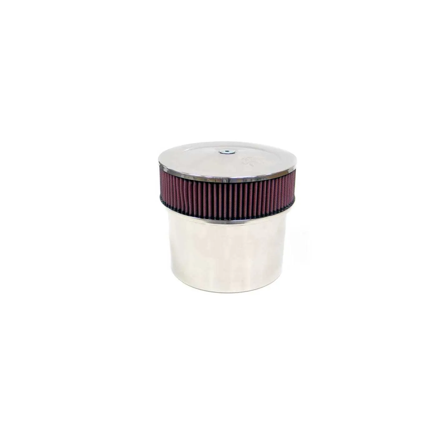 This complete air filter assembly has an all stainless steel top and base with a mirror finish. It's velocity stack has a 7-5/16 inch flange and the total height is 8-1/4 inches in height. It has an open 360 degree free breathing 9 inch Filtercharger air filter element on top of a stainless steel velocity stack base.