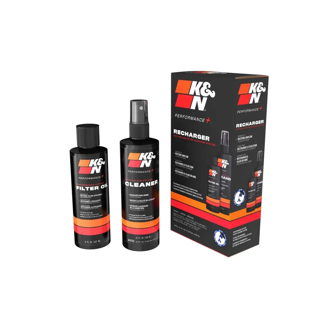 K&N Recharger Kit 99-5050BL is designed for cleaning your K&N oiled cotton air filter when it is time to be serviced. The kit comes with K&N Power Kleen air filter cleaner and K&N air filter oil. 99-5050BL will restore air flow efficiency and will bring your K&N oiled cotton air filter to like new condition. K&N Power Kleen works to dissolve the dirt build up and old filter oil, then it can be washed away with water. After the air filter fully dries re-oil your air filter then reinstall it. This Recharger Kit comes with an 8 ounce squeeze bottle of oil and a 12 ounce K&N pump bottle of Power Kleen air filter cleaner.