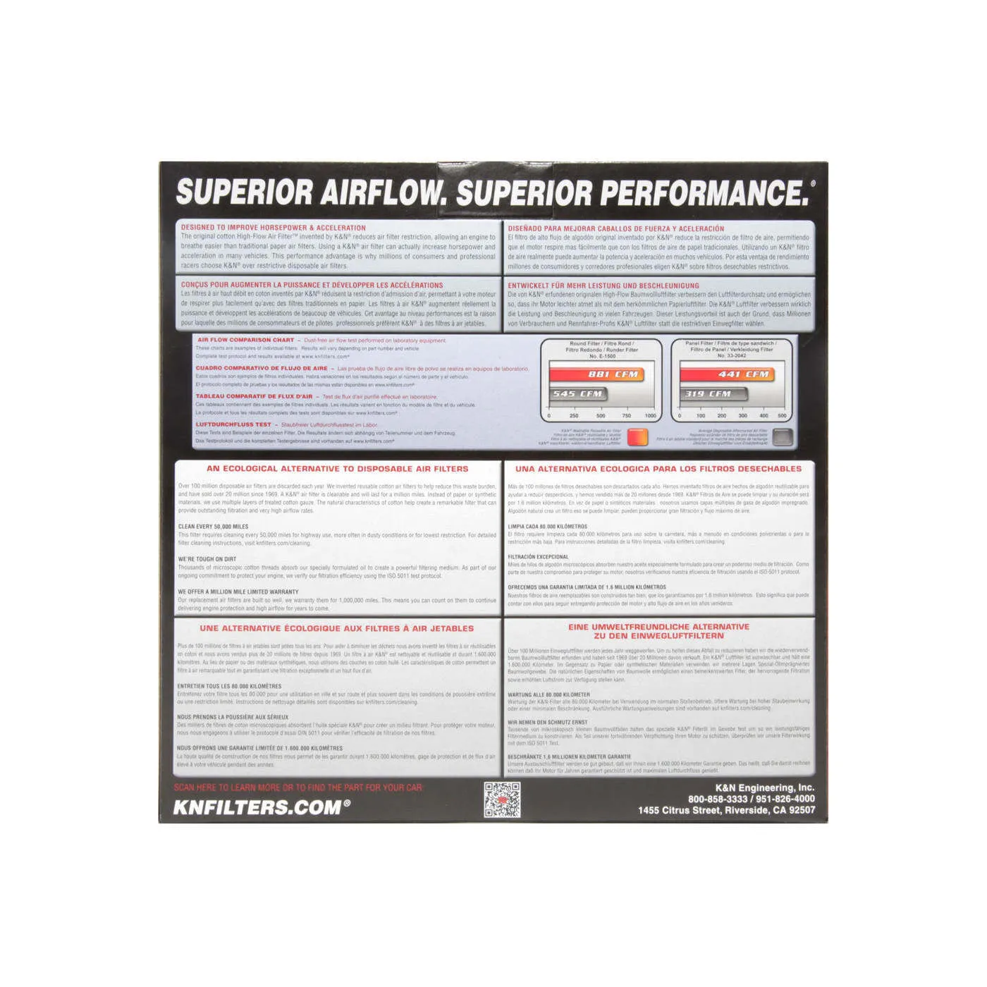 K&N® washable, reusable High-Flow Air Filters™ feature a state-of-the-art design of layered, oiled cotton media engineered to improve airflow and capture contaminants, and are designed to provide an increase in horsepower. Each performance air filter is reusable, engineered to last for the entire lifespan of your vehicle, and backed by K&N’s 10-Year/Million Mile Limited Warranty. K&N drop-in replacement filters are designed to install easily into your factory air box. Upgrade today and start enjoying superior airflow and superior performance from K&N’s most popular product!