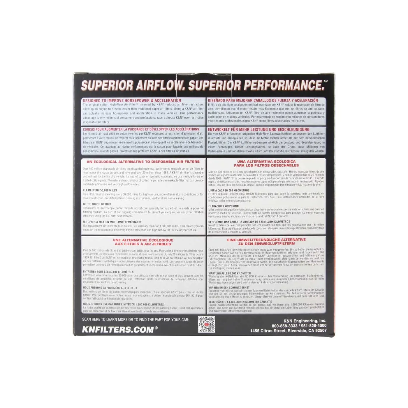 K&N® washable, reusable High-Flow Air Filters™ feature a state-of-the-art design of layered, oiled cotton media engineered to improve airflow and capture contaminants, and are designed to provide an increase in horsepower. Each performance air filter is reusable, engineered to last for the entire lifespan of your vehicle, and backed by K&N’s 10-Year/Million Mile Limited Warranty. K&N drop-in replacement filters are designed to install easily into your factory air box. Upgrade today and start enjoying superior airflow and superior performance from K&N’s most popular product!