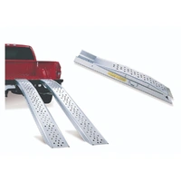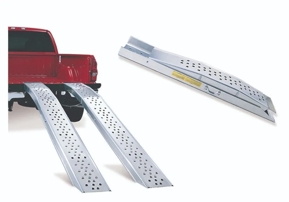 750 pound distributed load capacity per ramp. Flat, extruded hole surface provides versatility. Easy loading, accommodating all wheel sizes. Aluminum construction is durable, and rust resistant. Rubber angle protector to protect tailgate. Can be used separately. 12 3/8inch by 118inch design folds in half with a carrying handle for convenient storage.
