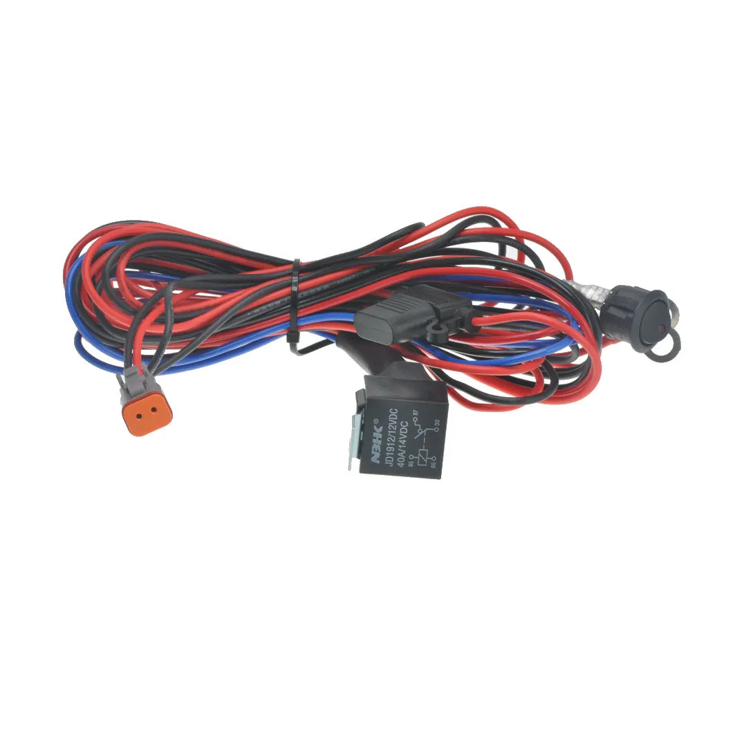 Harness incorporates a 40 amp relay, fully terminated two pin waterproof Deutsch connector and illuminated switch, with an inline fuse rated at 5 amps.