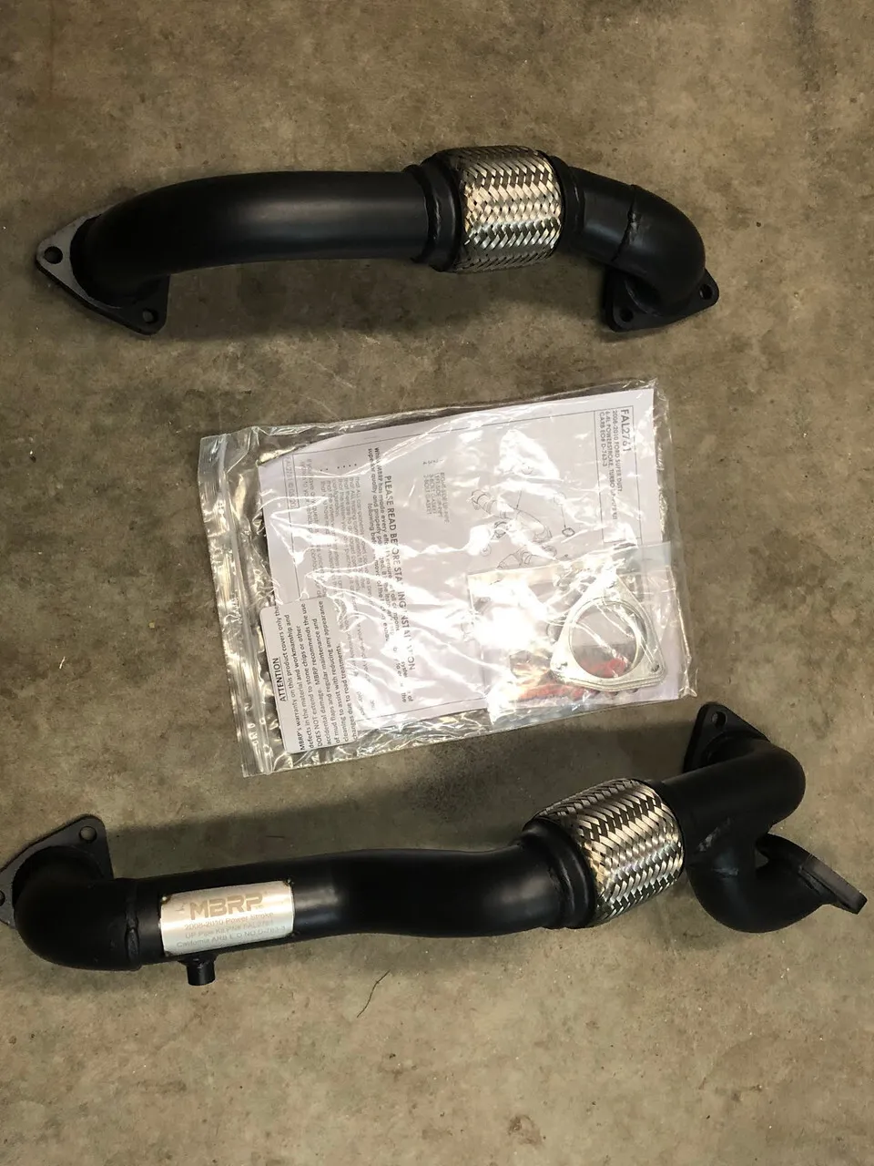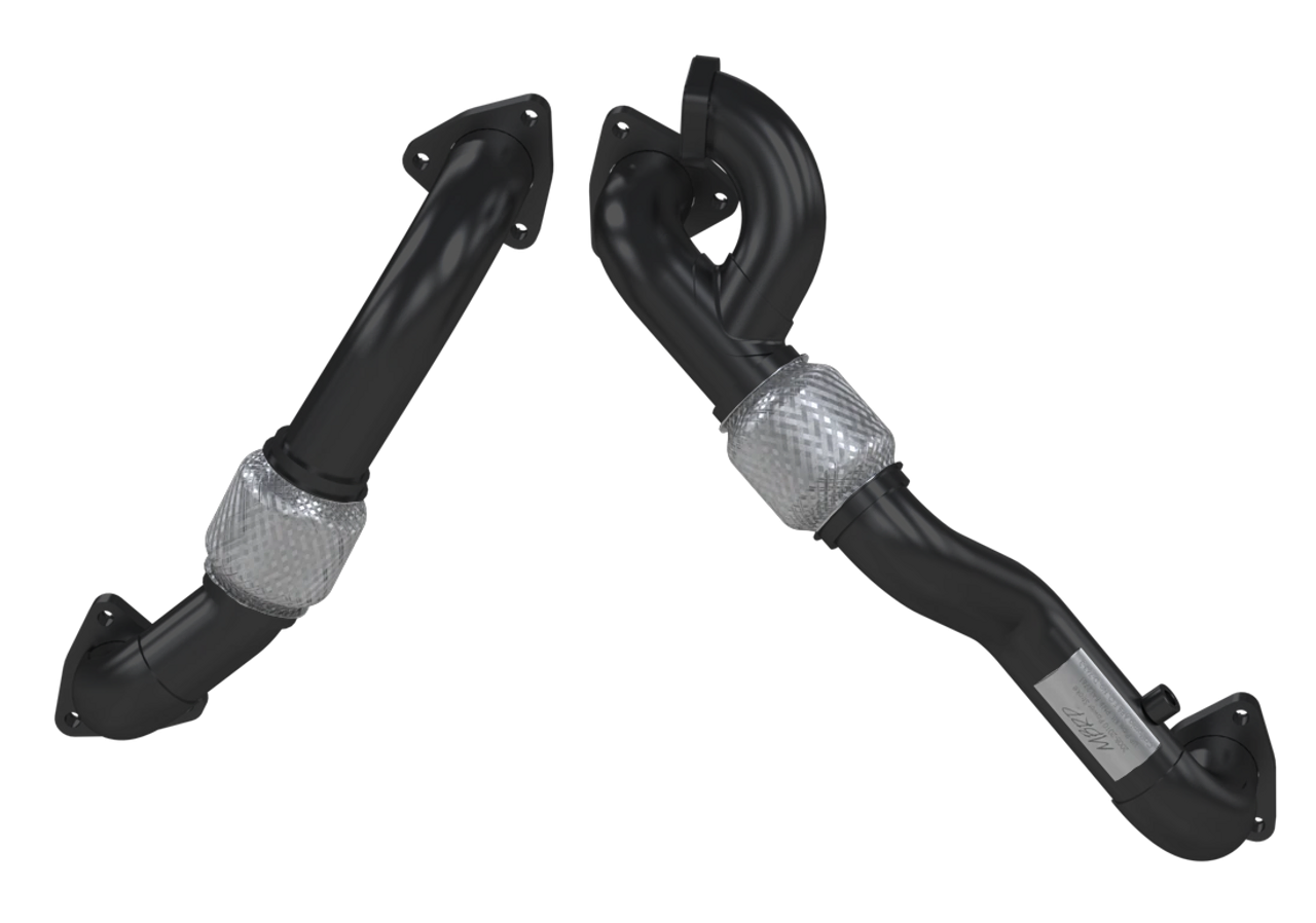 Improve the performance and reliability of your Ford Super Duty with a 6.4L Powerstroke diesel by upgrading the failure-prone stock turbo up-pipes. MBRP all new direct factory replacement turbo up-pipes are a bolt-on solution that will give your Powerstroke increased durability and wont affect the factory EGR system. These up-pipes are built from aluminized steel and have stainless steel turbo flex couplings.