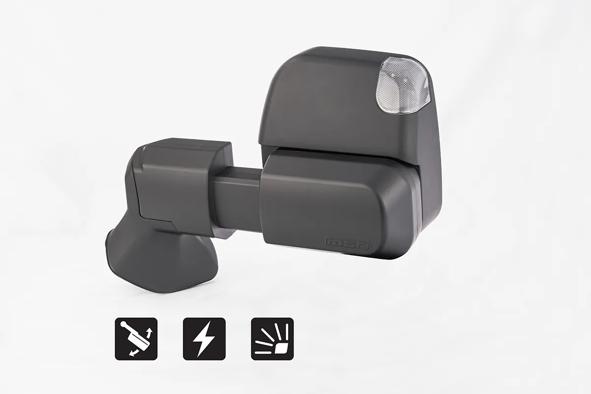 Mirrors feature a large single mirror that pivots on a heavy-duty extension slide. Allowing the mirror to extend out when towing and return to a normal driving position, when not towing.