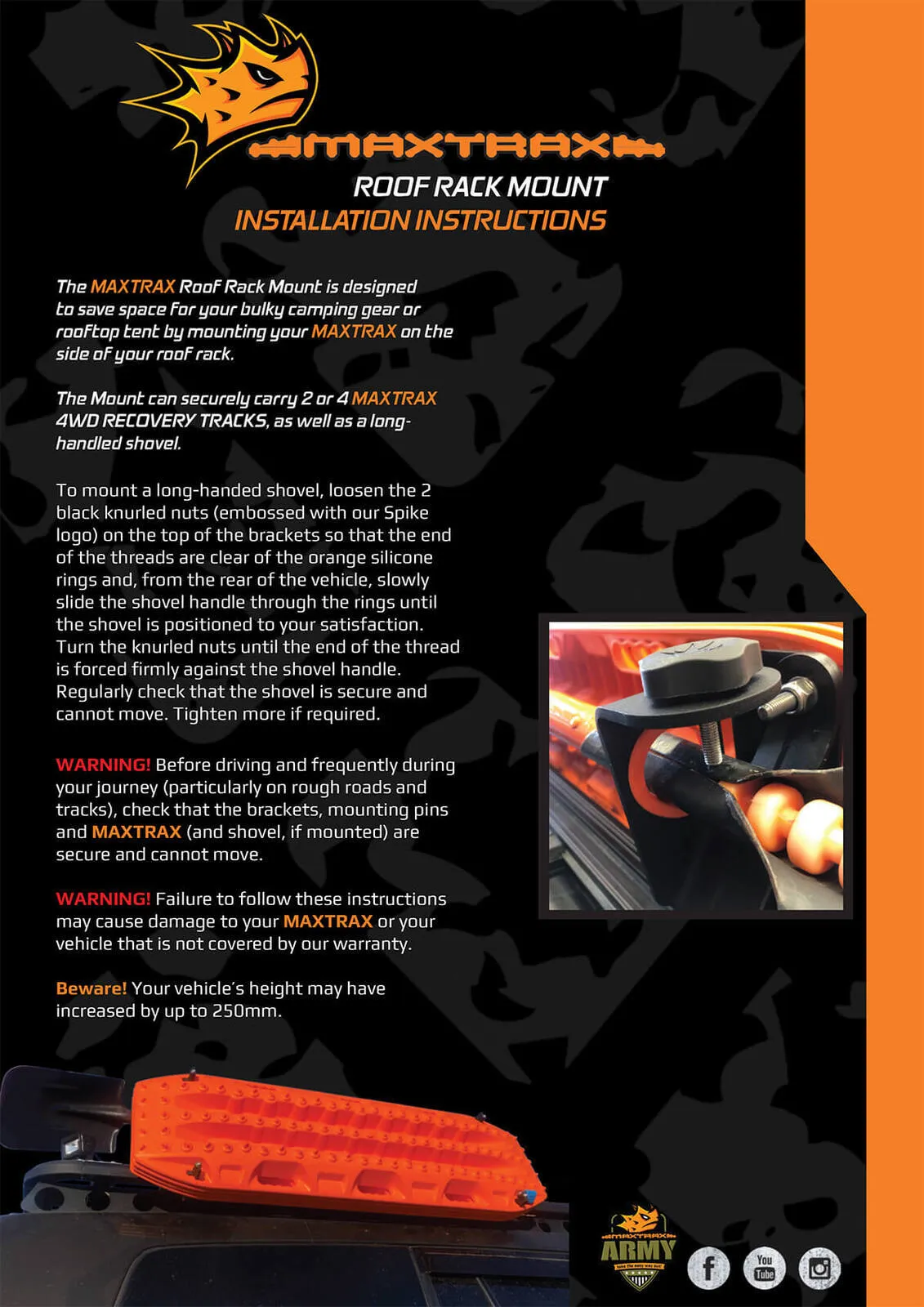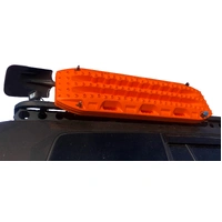 The MAXTRAX Roof Rack Mount is designed to save space for your bulky camping gear or rooftop tent by mounting your MAXTRAX on the side of your roof rack. The Mount can securely carry 4 MAXTRAX MKII, 4 MAXTRAX Xtreme, or a pair of each, plus a long-handled shovel.