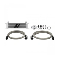 Proper oil temperature regulation is key to extending and preserving the life of your stock or high performance engine. Keep your temperatures in check with the Mishimoto universal oil cooler kit. This kit is applicable for most vehicles and includes all key components for reducing oil temperatures and providing your engine with extra protection against oil degradation. This kit includes a billet anodized aluminum sandwich plate in either standard or thermostatic form. The optional Mishimoto thermostatic sandwich plate provides additional temperature control and will limit oil flow to the cooler until optimal temperatures are reached, making it ideal for those in cooler climates. The included core is our proven Mishimoto 10 row stacked plate cooler which can withstand high fluid pressures and significantly reduce oil temperatures while exhibiting minimal pressure loss. This kit includes both a 3/4" -16 and M20-1.5 sandwich plate adapter which supports fitment for most makes and models. This kit also includes pre-assembled stainless steel braided oil lines with -10AN fittings and dowty seals for durable, leak free connections. Whether you are piloting a boosted rotary or blown small block the Mishimoto universal oil cooler kit will provide the efficiency you need to stay on the track and out of the shop. As with all our products this kit includes the Mishimoto Lifetime Warranty