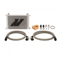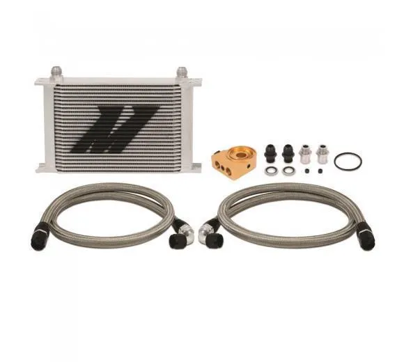 Proper oil temperature regulation is key to extending and preserving the life of your stock or high performance engine. Keep your temperatures in check with the Mishimoto 25-Row Universal Oil Cooler Kit. This kit is applicable for most vehicles and includes all key components for reducing oil temperatures and providing your engine with extra protection against oil degradation. This kit includes a billet anodized aluminum sandwich plate in either standard or thermostatic form. The optional Mishimoto Thermostatic Sandwich Plate provides additional temperature control and will limit oil flow to the cooler until optimal temperatures are reached, making it ideal for those in cooler climates. The included core is our proven 25-row stacked-plate cooler, which can withstand high fluid pressures and significantly reduce oil temperatures while exhibiting minimal pressure loss. This kit includes both a 3/4" -16 and M20-1.5 sandwich plate adapter which supports fitment for most makes and models. This kit also includes pre-assembled stainless steel braided oil lines with -10AN fittings and dowty seals for durable, leak free connections. Whether you are piloting a boosted rotary or a blown small block, the Mishimoto 25-Row Universal Oil Cooler Kit will provide the efficiency you need to stay on the track and out of the shop. As with all our products this kit includes the Mishimoto Lifetime Warranty