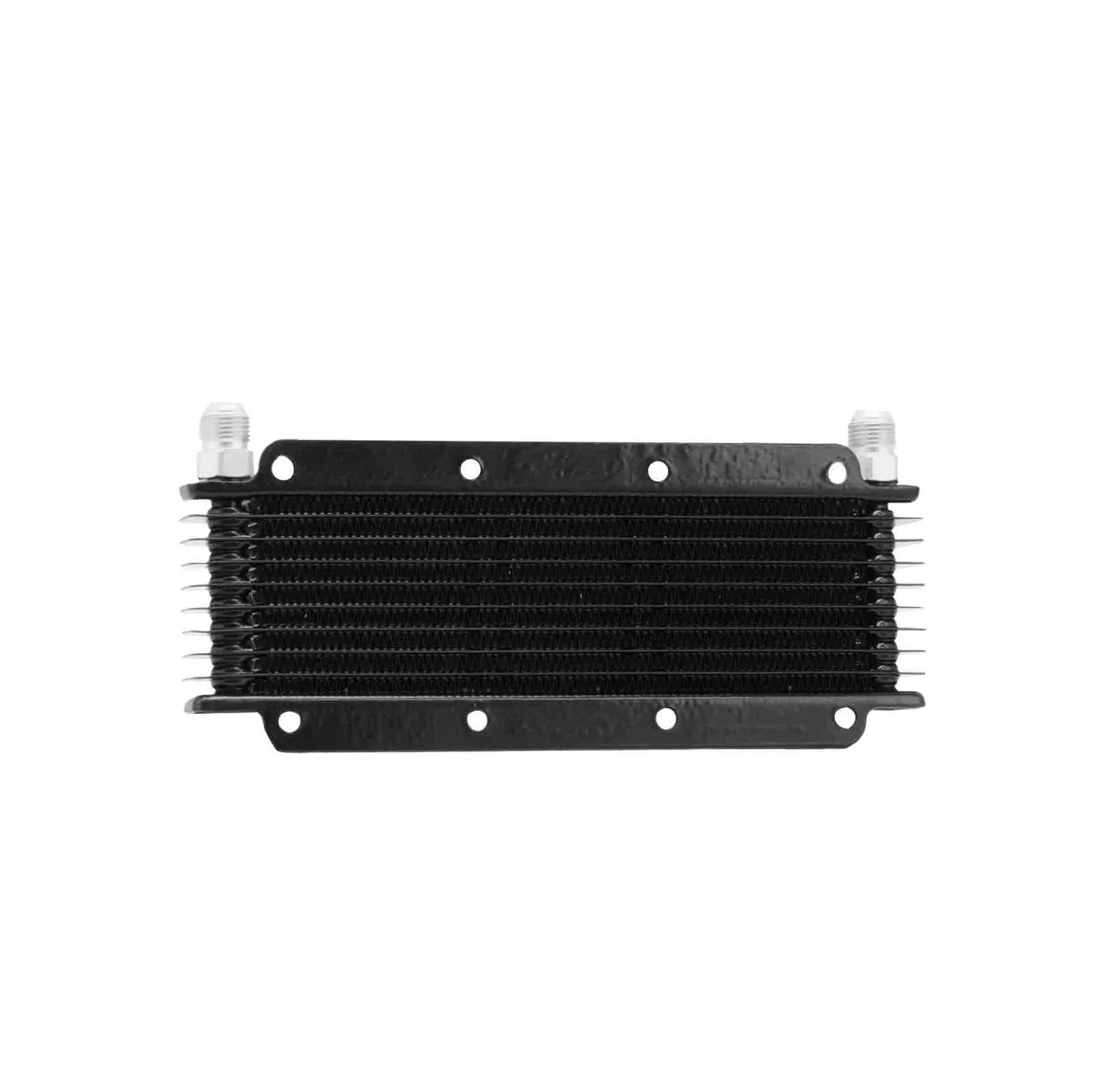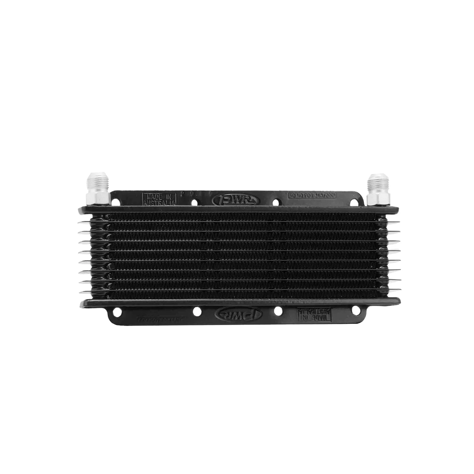 PWR’s patented plate and fin transmission oil coolers are made from 100% aluminium construction which allows the cooler to be made strong, lightweight and compact while offering high heat transfer and corrosion resistance. The plate design turbulates the oil flow and in conjunction with the unique louvered fin design provides highly efficient cooling with low-pressure drop. Manufactured with a 19mm core, these coolers are perfect for automatic transmissions, power steering and differential cooling for race and road applications. Offered with 5/16?, 3/8” or 1/2" push-on hose barbs or Dash -6 AN male threaded fittings. 5/16” and 3/8” can be ordered in kits containing hose, hose clamps and mounting hardware. Custom fittings for specific applications such as thermo switch bosses for thermo fan operation can be special ordered.