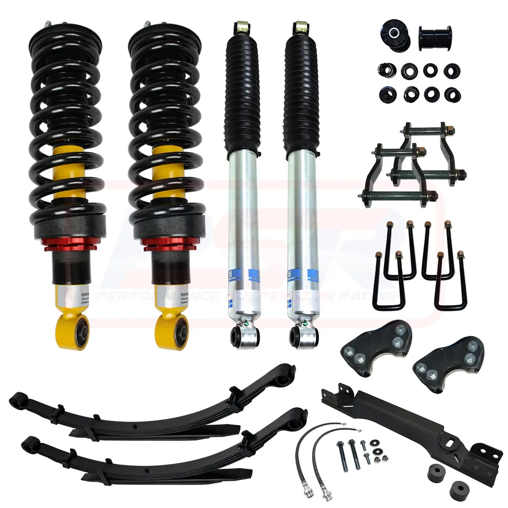 This system sits at 3" front and 2" rear to sit the car level and includes our PSR diff drop kit, PSR ball joint spacer, PSR spec Bilstein 2 - 4" height adjustable struts all pre-assembled with Kings Coil Springs, Bilstein Long Travel Rear Shocks, 2" leaf springs, extended brake lines, leaf spring bushes, greasable shackles and U-bolts.