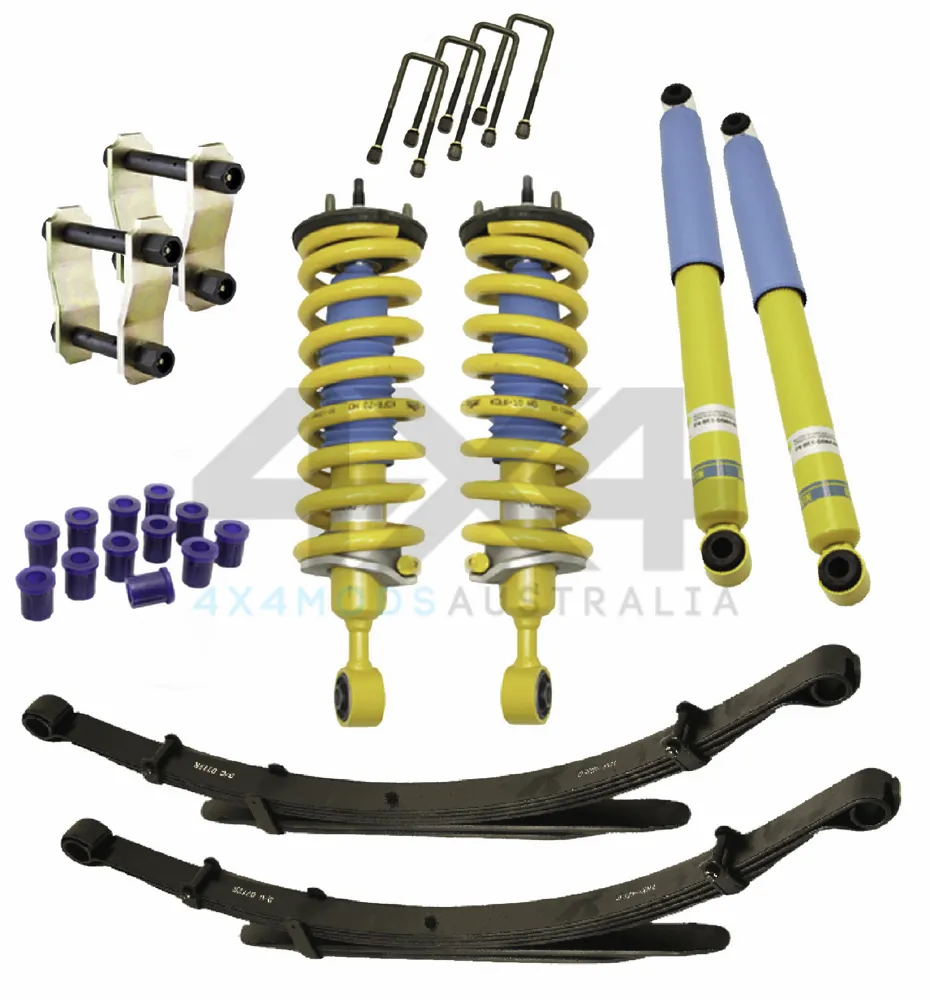 This kit contains Bilstein front struts all pre-assembled with Kings coil springs and HD strut tops, EFS leaf springs, U-bolts, greasable shackles, new leaf bushes, Bilstein rear shocks and brake line extension.