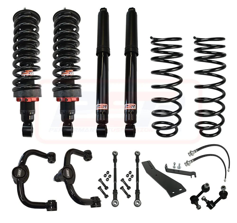 This system sits at 2" front and 2" rear and contains our custom height adjustable PSR TTG front struts fully assembled with Kings coil springs and PSR HD top mounts, PSR upper control arms, HD front sway bar link pins, PSR 2" rear flex coils, PSR TTG rear shocks and headlight aim bracket.