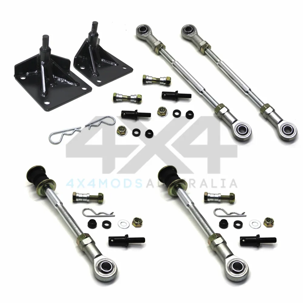 This kit contains our high chassis mount front sway bar link/disconnects & rear adjustable swaybar link/disconnects to suit all GQ coil rear wagon & ute variations. Sway bar disconnects are designed to allow sway bars to work as intended while on road and then disconnect to allow free suspension movement without restriction from the sway bar when off road. Supplied with bolts to use as a fixed extended sway bar link pin.