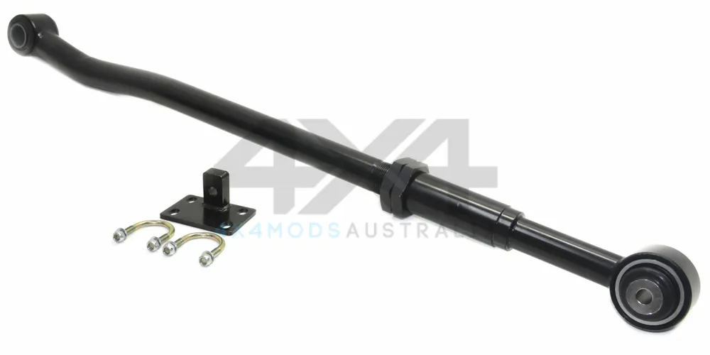 Peformance Suspension's Nissan Patrol GU Series 2 onwards front panhard bar is designed to be the strongest on the market. Made from solid oversized 35mm chromoly bar in an off car adjustment configuration it features double locking nuts, heavy duty welds and a fine thread which means our panhard bars are super tough. Tested lengths to allow driveline realignment and also provide enough adjustment for your wheels to clear chassis and other important items around your tyres. Smart design means all bars take factory sizes bushes so when you need to change them out you can source replacement bushes anywhere in Australia. This model Patrol comes with new spherical bushes on the chassis end and new bushes at the diff end. Finished in Black to blend to the chassis and for a on service life. Bar comes with a heavy duty bracket for a tapered pin style damper. Check cab chassis fitment for Series 2 onwards.