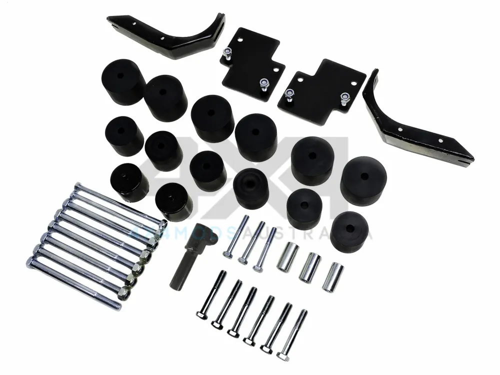PSR offers a complete bolt-in 1" Body Lift Kit for a single or extra cab variation with a tub. Kit is supplied with high tensile bolts and blocks to the size or larger than OE body mounts to be compliant. Kit comes with a bolt in steering column extension. Also supplied is a reo bar lift bracket to allow the factory reo to be retained if plastic bumper is still fitted to vehicle. Spacers are supplied to couple the factory splash guard if retained. An auto line bracket is supplied for auto models so cooler line will not rub on the sway bar. Kit is complete with no additional items required to purchase to Body Lift your Isuzu DMAX 1". Suits DMAX1 and DMAX2. Extra / Single Cab (WITH TUB). **Kit requires you to trim approx. 15mm from your factory steering column shaft** Blocks are machined from 6061 T6 Alloy block and anodized black.
