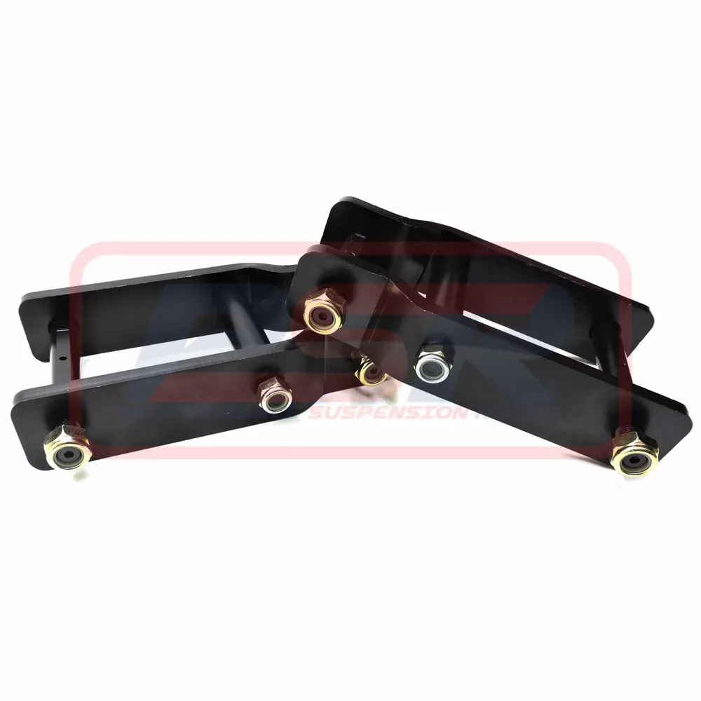 PSR's extended shackle for the strut Front Holden RG Colorado & Isuzu D-MAX models is a super heavy duty leaf spring shackle. Designed to a length that provides 2" of lift it features side plates made from 10mm laser cut steel, CNC machined and welded pins. Pins are greaseable for a long service life. Welded design is far superior to other designs on the market as it reduces shackle walking and flexing under load. Others are designed around a centre welded support with no outer support where it is needed. Coated Black to blend with the chassis.