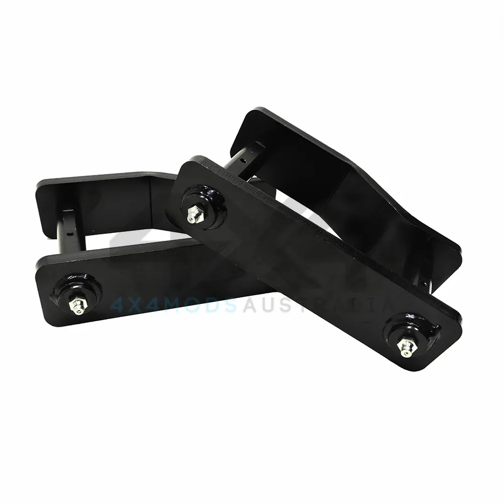 PSR's extended shackle for the Mitsubishi Triton, L200 2WD & 4WD-ML-MN 7/2006-on model is a super heavy duty leaf spring shackle. Designed to a length that provides 1" of lift it features side plates made from 10mm laser cut steel, CNC machined and welded pins. Pins are greaseable for a long service life. This shackle was designed due to its ability to give 1" lift and free up leaf spring movement. The factory shackle is only 85mm on and severely restricts leaf movement. Couple this shackle to a 2" lift leaf to gain a 3" lift to complement a front end that only allows for a 3-3.5" lift. Coated Black to blend with the chassis.
