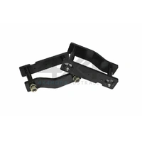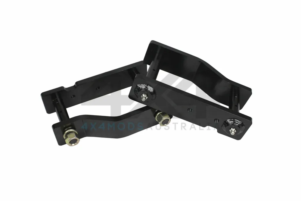 PSR's extended shackle for Toyota Hilux N80 15-on model is a super heavy duty leaf spring shackle. Designed to a length that provides 1" of lift it features side plates made from 10mm steel, CNC machined and welded pins. Pins are greaseable for a long service life. Welded design is far superior to other designs on the market as it reduces shackle walking and flexing under load. Others are designed around a centre welded support with no outer support where it is needed. Has provisions for the factory headlight aim bracket to be refitted. Coated Black to blend with the chassis.