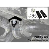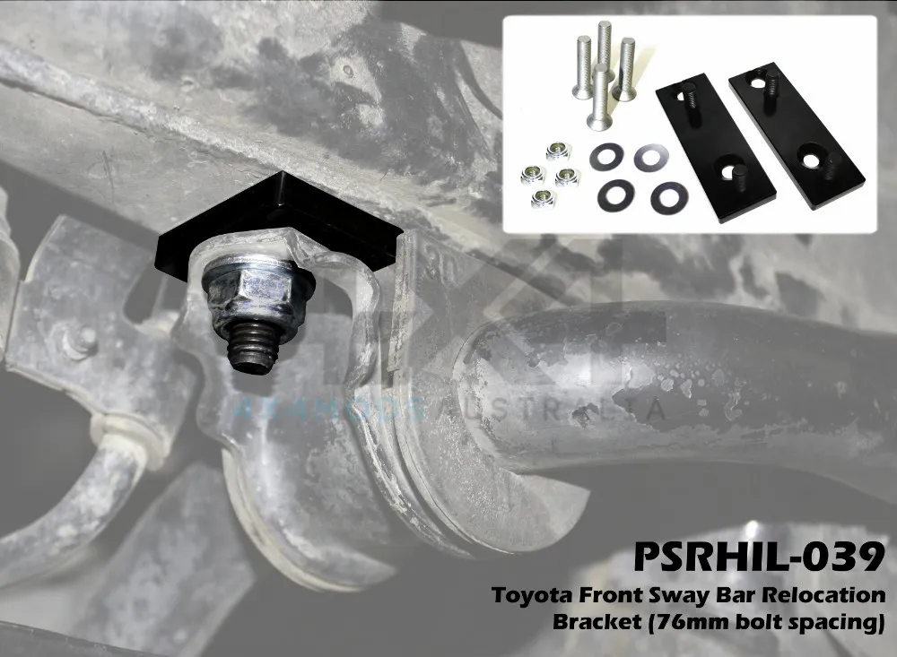 PSR's Toyota Hilux N70 05-15 front sway bar relocation system is designed to allow more clearance from the sway bar to the strut assembly and are 100% bolt-in. Unlike other brands our kit features countersunk bolts and press in studs to reduce the thickness of the main plate meaning the possibility for contact between the sway bar and the radiator supports is eliminate, or only minor. Supplied with studs pre pressed into the plate for easy installation and removal they are E-coated Black and come with all required components to install. Mounting bolt centers are 76mm. May be required when installing PSRHIL-011.