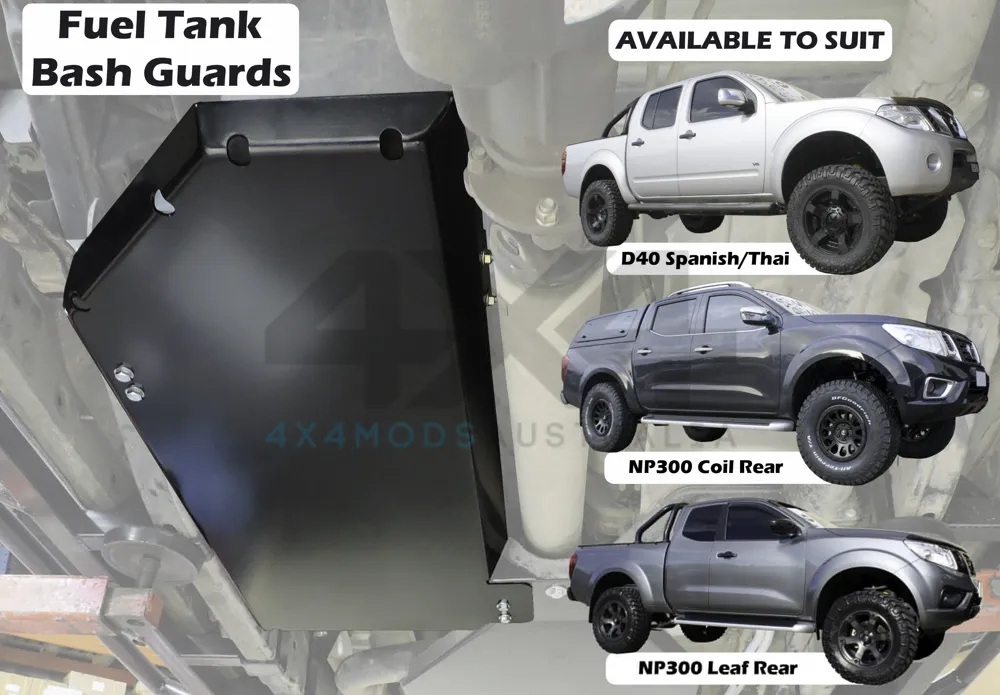PSR's Nissan Navara D40 Fuel Tank Guard is made from 4mm steel and couples to rear guard. It bolts to all factory mounting points with an additional mount at the front eye bolt.