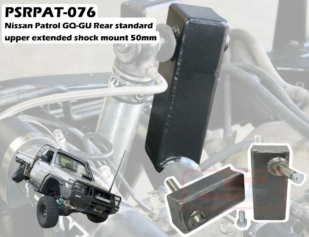 PSR's Nissan Patrol GQ-GU Rear Extended Shock Mounts are a weld on mount that replaces the factory location on the diff. This is an area which can greatly improve the rear suspension through modified mounting heights to suit different shock lengths, achieving desired travel of your rear suspension. Depending on requirements both the diff and the chassis mounts can be modified.